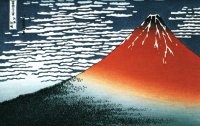 Woodblock - Just for Fun. Red Fuji = Japanese “Aka Fuji” = 1837 AD. Artist = Hokusai Katsushika One of the famous “36 Views of Mount Fuji” by Hokusai. Traditionally called "Mount Fuji in Clear Weather."