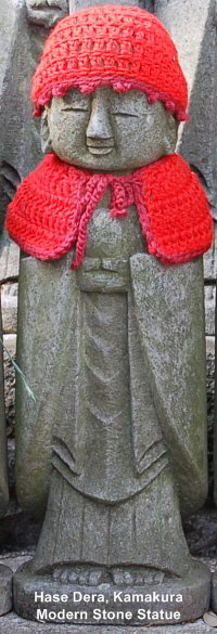 Puzzling over Malta Kano's ever-present red vinyl hat, I recalled the many small, stone statues of a seated figure with a red cloth shawl or bib and turban (sometimes plastic) that I had seen at various places in Japan. Often there were as many as twenty grouped together, but always they had red cloths on their heads and shoulders. I have since learned that they honored a bodhisattva named Jizo, whose function is to help those in danger of the realms of hell, and that these were memorial statues, sometimes for aborted children (a theme also in the novel). Red, according to folk belief in Japan, is the color thought to "expel the devil." <end quote from Dreams, Myths & Fairy Tales in Japan; Einsiedeln, Switzerland, Daimon, 1995.>