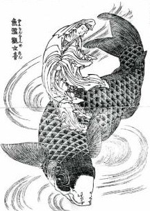 Kannon Gazing at the Moon in the Water. One of 33 Forms of Kannon. The imagery is akin to the symbolism of the mirror -- i.e., it represents the emptiness of all phenomena (i.e., life is illusion), for the mirror does not represent reality -- it merely provides a reflection of reality. Thus, the mirror is a metaphor for the unenlightened mind deluded by mere appearances. Also see the famous Buddhist parable from China known in Japan as Enkō Sokugetsu 猿猴捉月. Translated as "Catching the Moon’s Reflection," it tells a similar story of the unenlightened mind deluded by appearance, one evoking the emptiness of the moon’s reflection in water.